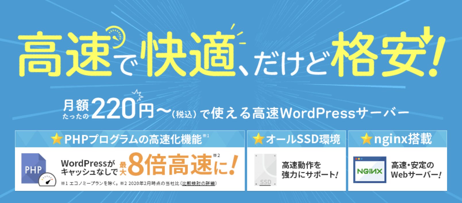 また、WordPressを使える最も安いプランは「ライトプラン」は月額220円ですから、料金面では気軽にブログを始めやすいのではないでしょうか。