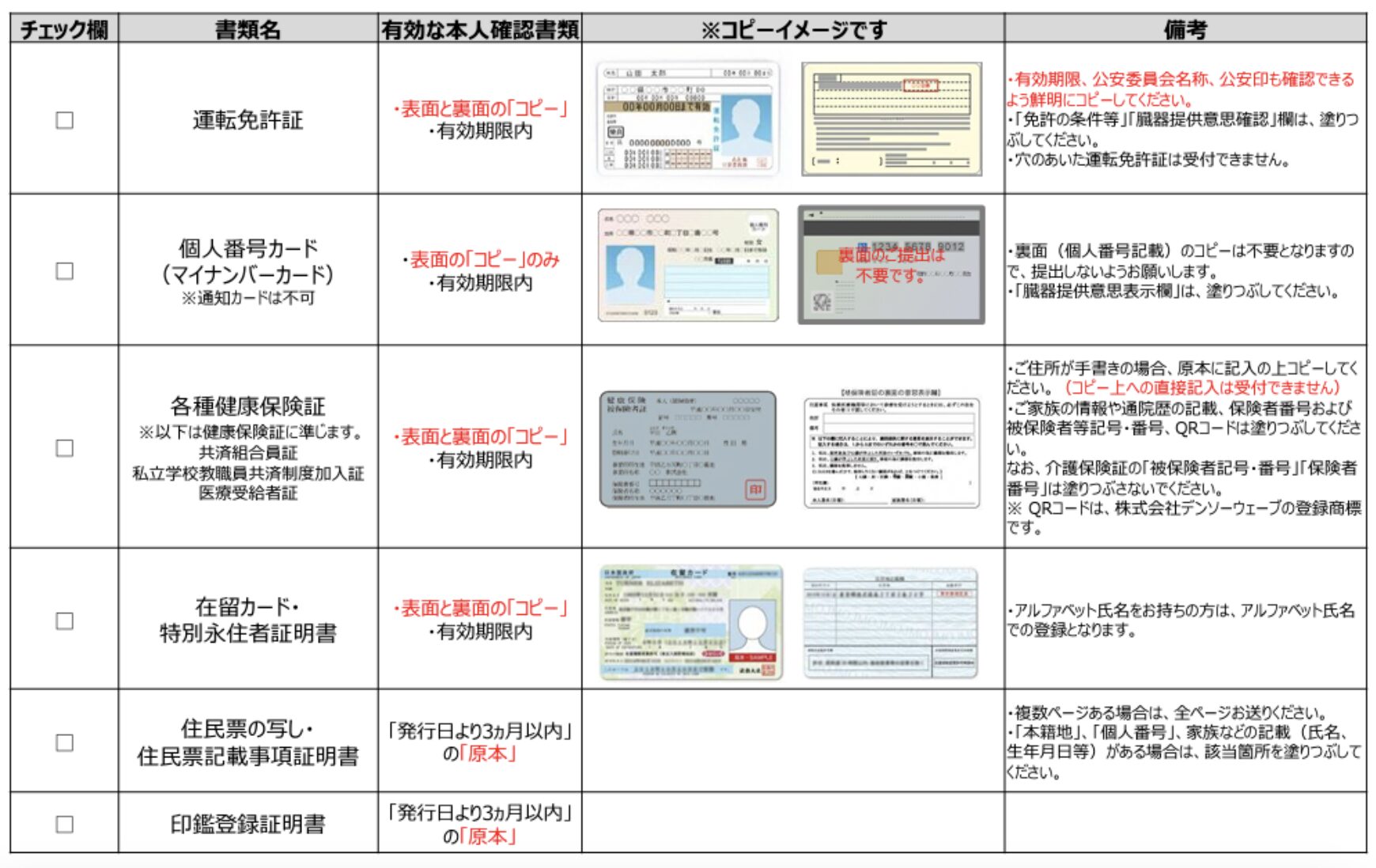 本人確認資料として利用できるのは、下図のとおり「運転免許証」「マイナンバーカード」「各種健康保険証」「在留カード・特別永住者証明書」「住民票の写し」「印鑑証明書」となります。